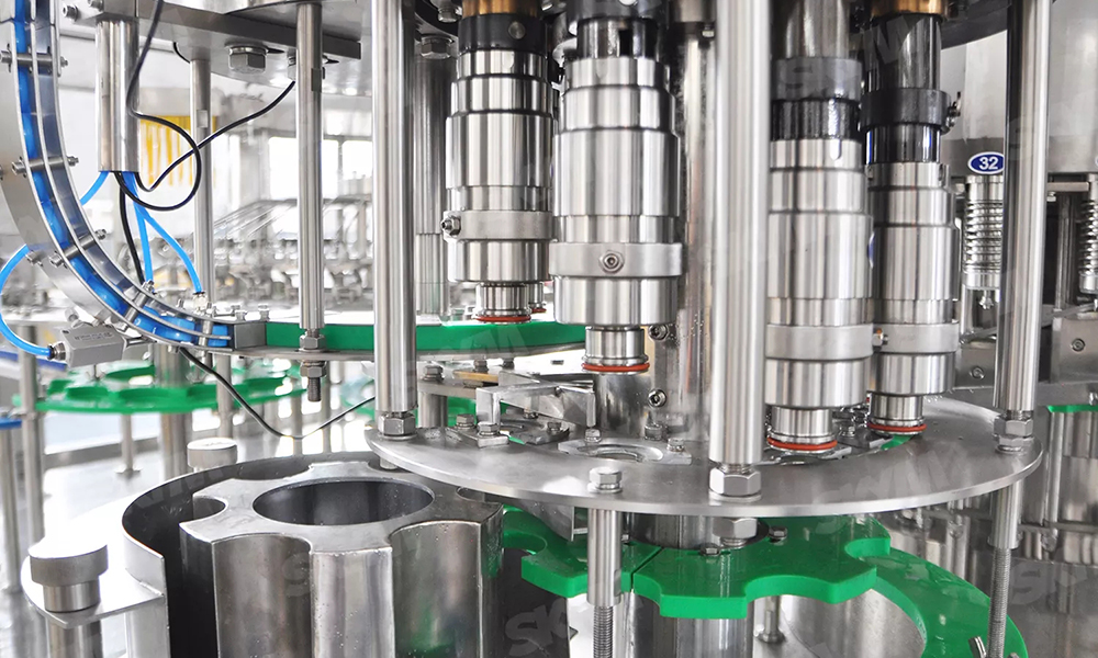 The filling valve material is SUS304.The filling system has liquid level automatic control.Filling valve elevator, after filling valve contact the bottle neck, it starts to fill. -